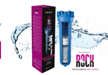 El filtro **DP BIG MONO** viene con accesorios incluidos, destacando la tecnología **ScaleArmor™ ROCK** que ofrece una **prevención certificada de incrustaciones de hasta un 86%** en el sistema. El gráfico adjunto muestra la caída de presión ($\Delta$p) en función del caudal, manteniendo un rendimiento eficiente.